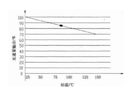 結(jié)點(diǎn)溫度是影響LED芯片的光通量輸出的關(guān)鍵因素,LED 的光通量輸出隨著結(jié)溫的上升而降低。LED廠家的技術(shù)參數(shù)手冊(cè)列出LED 在結(jié)點(diǎn)溫度為25 ℃ 時(shí)的光通量值,而大多數(shù)安裝在燈具內(nèi)的LED 芯片由于受到燈具散熱條件的限制都具有較高的結(jié)點(diǎn)溫度,一般結(jié)溫在75 ℃~90 ℃之間。當(dāng)結(jié)溫大于25 ℃時(shí),光通量肯定比LED 技術(shù)參數(shù)手冊(cè)給出的值少。以某品牌的XR-E 大功率LED 的結(jié)溫與光通量輸出的關(guān)系為例(見(jiàn)圖1),當(dāng)LED 芯片的結(jié)溫在85 ℃左右時(shí),依照此圖光通量輸出為25 ℃時(shí)85%。因此在設(shè)計(jì)燈具中應(yīng)通過(guò)散熱設(shè)計(jì)盡量降低LED芯片的結(jié)點(diǎn)溫度以提高LED 芯片的光通量輸出, 從而達(dá)到提高燈具效率的目的。