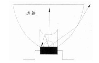 透光率是LED 透鏡的一項(xiàng)重要技術(shù)參數(shù),直接影響到透鏡的使用效果。目前在大功率LED 燈具中通常使用的透鏡為全反射式透鏡,國(guó)內(nèi)外知名LED 透鏡廠家可以將這種透鏡的透光率達(dá)到89%, 即LED 光源所發(fā)出的全部光通量一般有10%以上的損耗。這些損失的光可以被分為三種(見(jiàn)圖2): LED 的正上方透鏡表面所反射的光、被透鏡吸收的光、通過(guò)LED 透鏡側(cè)面被折射的光。